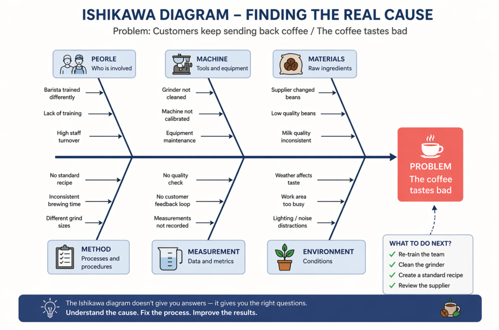 You sit down and draw the fishbone. Under People, you notice your barista was trained differently from the rest of the team. Under Machine, you discover the coffee grinder hasn’t been cleaned in two weeks. Under Method, there is no standard recipe, everyone is guessing the measurements. Under Materials, you find out the supplier quietly switched to a different bean last month without telling anyone.